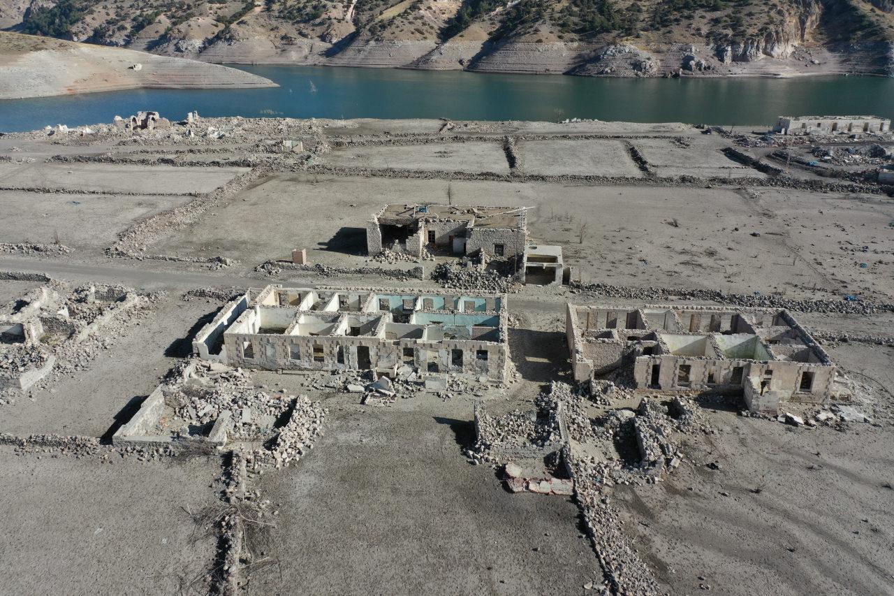Baraj kapaklarının kısmen açılmasıyla su seviyesi düşünce köydeki evler, cami, kilise ve bazı tarihi binalar gün yüzüne çıktı.